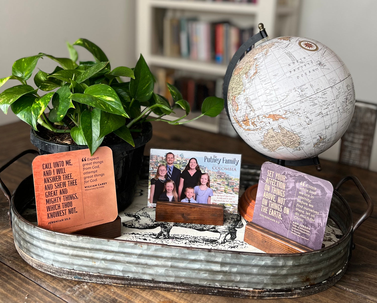 The Lord has placed a big burden on my heart this year for missions. We recently rearranged our living spaces, which gave me the opportunity to make this centerpiece for our dining room table. I usually have my Bible and prayer time here in the mornings. It also gives us the opportunity to remember our missionaries as we gather around the table for dinner. We switch out the missionary prayer cards daily and the verse cards as desired. God is so tender to give us ways to make our prayer lives personal, specific and intentional!